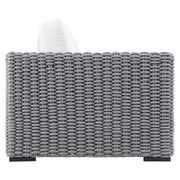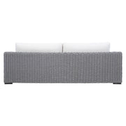 Bernhardt Exteriors is characterized by exceptional luxury, ultimate comfort and stylish design. Crafted from woven rope in a Grey Mist finish, the Capri sofa is linear and low-profile with track arms and aluminum block feet. The ultra-modern frame holds loose fiber back pillows and plush cushions designed for luxurious comfort and maximum water resistance. A natural aesthetic meets contemporary style for a sophisticated yet relaxed feel.