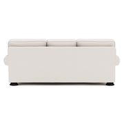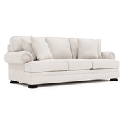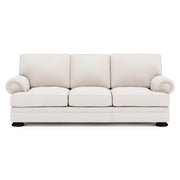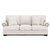 The stately Foster sofa offers comfortable support with an air of traditional grandeur. The plush cushions invite relaxation, while rolled arms, nailhead trim, and wide bun feet exude refinement. Throw pillows complement the sofa and surrounding decor.