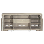 An elemental, serene design marks this stunning Arcadia entertainment credenza. The door fronts have faux stone overlays in Kalta finish that mimic flowing woodgrain or swirls of natural marble. A tactile element is provided by a wire-brushed oak case in Clay finish, while the interior provides functionality with adjustable shelves and a drawer. The base takes a unique approach with four supports that wrap up the sides of the credenza.