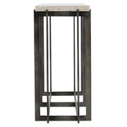 Bernhardt Occasional offers upscale designs for luxe living spaces. The Hathaway console table presents contemporary style with geometric leanings. With origins in mid-century design, the sleek tubular steel base provides structural stability and clean, bold lines. An oil-rubbed bronze finish on the base creates an engaging contrast with the white travertine stone top, which features a chiseled edge.
