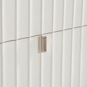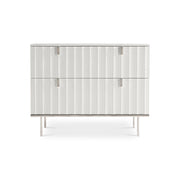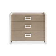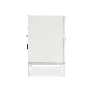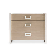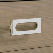 With its design inspired by midcentury modern styles, the Modulum nightstand is finished in Sahara with a center case that floats between white Adobe side panels. A gallery rail around the top is also finished in Adobe. A recessed bank of three soft-close drawers is highlighted with metal hardware that has a distinctly retro design. Adding function to the form, a two-port USB charger is included on the back of the nightstand.