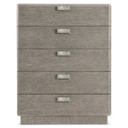 The Monolith tall drawer chest showcases perfect proportions that create a balance of modern and rustic styles. A plinth base supports a bold case that is defined by rounded corners and is finished in Puma. Five soft-close drawers are highlighted by geometric cast aluminum hardware in Graphite finish.