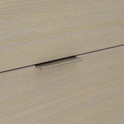 Monolithic panels of cast aluminum in shiny nickel finish create an elemental look on the Solaria tall drawer chest. Featuring quartered white oak veneers in a Dune finish, the wooden case floats above a faux stone base, while a matching top echoes the base. Four drawers open with sleek metal finger pulls.
